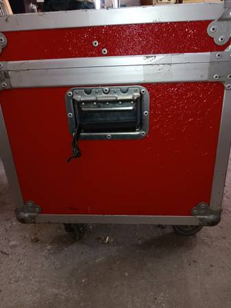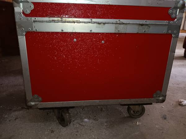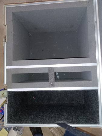 This carrying case is made of steel and aluminum with foam inserts & sturdy wheels for travel. Measurements are: 18" W x 17" H, and 24" L It weighs 30 lbs. empty