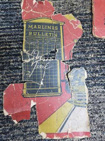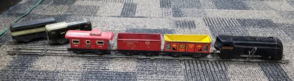 This is a very nice antique MARX toy train. It is in excellent condition, still runs, and the whistle works too! Shows some signs of age and is not perfect, but is very respectable and working. Dates to 1900 and is formed from pressed steel. Set includes the wind up engine locomotive, Pennsylvania RR railroad coal car, Northern Pacific General Col Car hopper, and New York Central Caboose. I am also including a bunch of track, fragments of the original box, and 2 other pressed steel New York Central cars. The set is O gage. If interested, please call or text 7two4 746 9190. No emails please.
