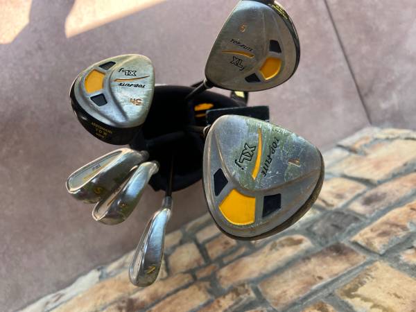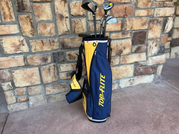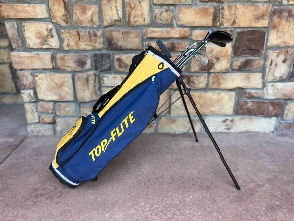 Full set of junior Top Flight XLj golf clubs, includes carry bag. Left handed. Very good condition.