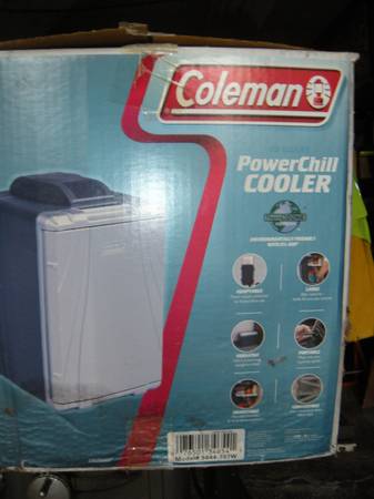 Coleman 40 quart PowerChill Cooler. 12 volt and 120 volt to 12 volt converter. Use in either upright or as a chest.