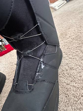 Men’s size 9.5 K2 snowboarding boots. I paid over $200 new for them and they were only worn one season. There is a scuff on one boot (pictured) but in no way affects the quality/use of the boots....