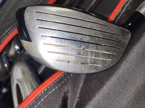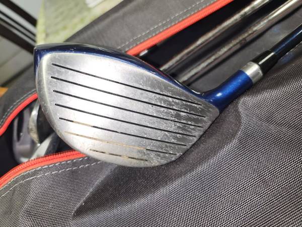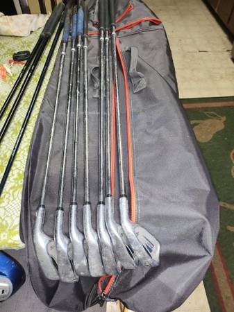 set includes 3 metal woods with graphite shafts and irons with metal shafts 4-9, pw, putter and carry bag