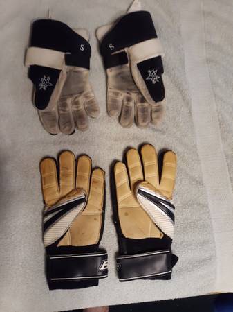 Mylec 592, no size tag but has (S) embroidered on cuff? Brine size (8). I have big hands and they both fit snug and feels like a medium to me? Both pair are in great used condition with no torn stitching or damage. The Mylec palms are just darkened on the leather. Brine palms have grippy type material? Make offer. Text only please.