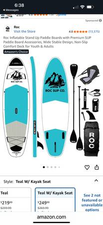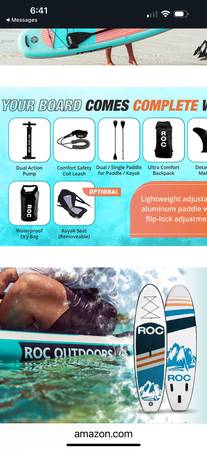 Brand new. Never out of the box. Received as a gift last Christmas and then health issues (aging) kept me from even being able to try it out. Comes with pump…. Paddle….removable seat… leash etc. see the pics for original ad from Amazon. Was $250 when purchased by my husband for me.