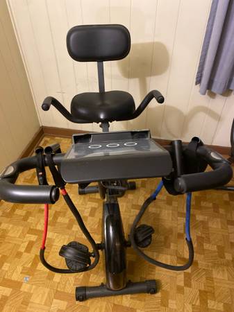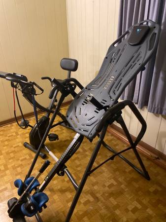 Two very nice orange hunting coats, one from Gander Mountain, one from Cabellas, and one from LL Bean, (wool). All three coats are like new and waterproof. Stationary bike with upper body strength pulleys and a new inverted machine that has the ability to gradually move you from being parallel to hanging upside down by your feet relieving any discomfort and pain that correlates with your neck and back vertebrae. One 42 inch Vizeo television, flat screen and HDMI.