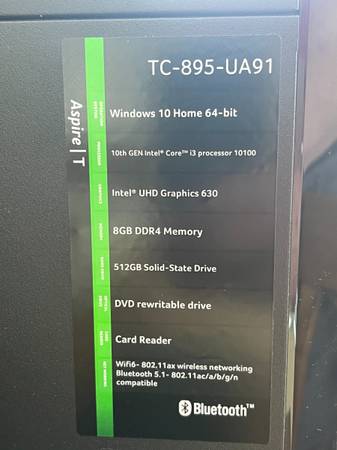 Acer Aspire TC-895-UA91 Desktop PC comes with these specs: 10th Generation Intel Core i3-10100 4-Core Processor 3.6GHz with Turbo Boost 2.0 Technology up to 4.3GHz, Windows 10 Home, 8GB DDR4 2666MHz RAM Memory, Intel UHD Graphics 630, 8x DVD Writer Double Layer Drive (DVD-RW), 512GB NVMe M.2 SSD, High Def Audio with 5.1-Channel Surround Sound Support, 1 - USB 3.2 Type C Gen 1 port (up to 5 Gbps) (Front), 1 - USB 3.2 Gen 1 port (Front), 4 - USB 3.2 Gen 1 ports (Rear), 2 - USB 2.0 ports (Rear), 2 - HDMI ports (Rear), Intel Wireless Wi-Fi 6 AX200 802.11ax Dual-Band 2.4GHz and 5GHz featuring 2x2 MU-MIMO technology, 10/100/1000 Gigabit Ethernet LAN (RJ 45 port), Bluetooth 5.1, 300W power supply.