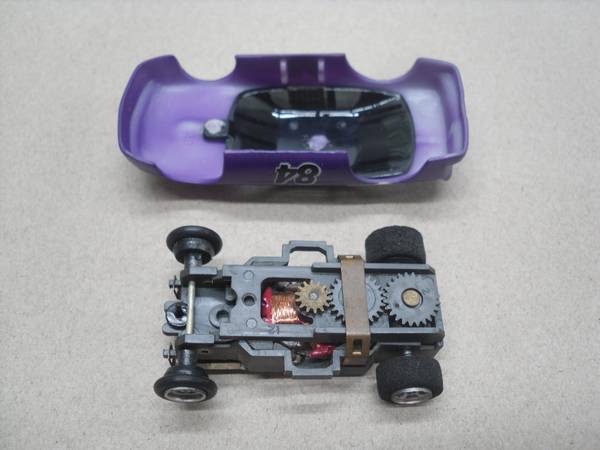 Purple, #84, Ford Thunderbird with original Aurora AFX chassis.