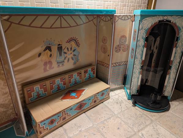 Awesome retro 1976 Cher's dressing room playset. Clean and smoke-free home. Made by Mego Corp and in the original box the set latches together for easy transport. Some accessories included (couch, foot rest, dresser, carry handle). No dolls or clothing. The figurine swivel moves freely like it should. Pick up only.