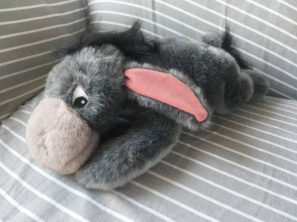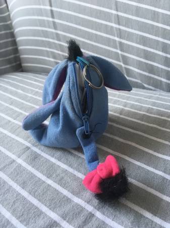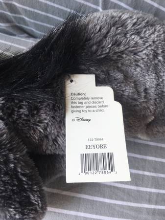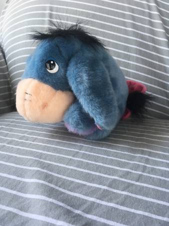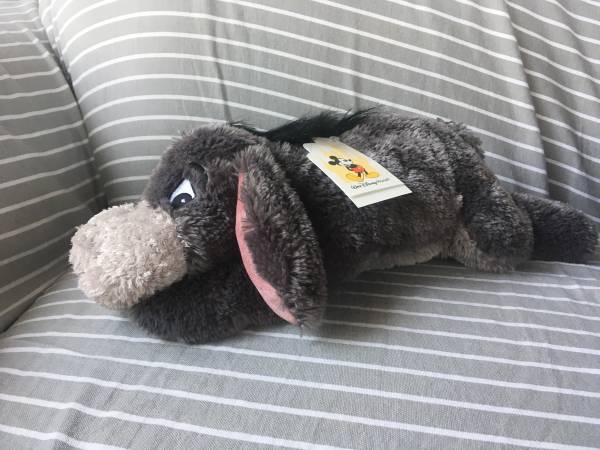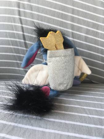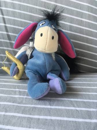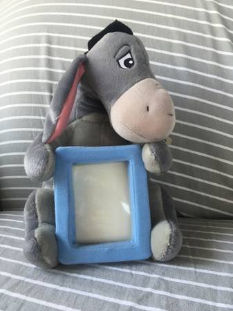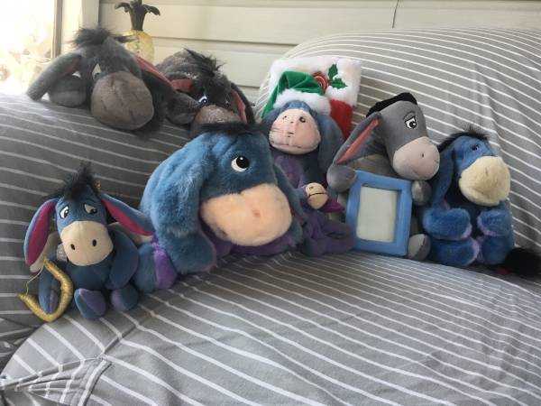 Various plush Eeyore stuffed animals including a Christmas Stocking, Cupid, Key chain, Disney with tags, Picture frame.