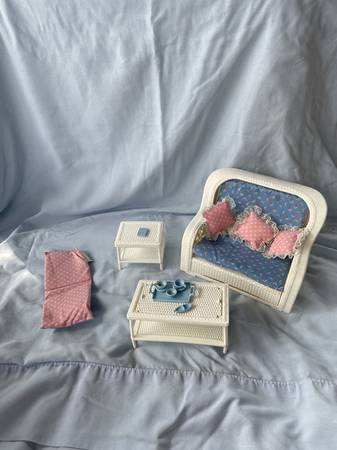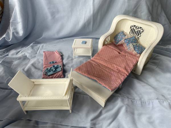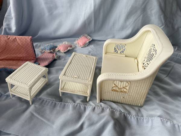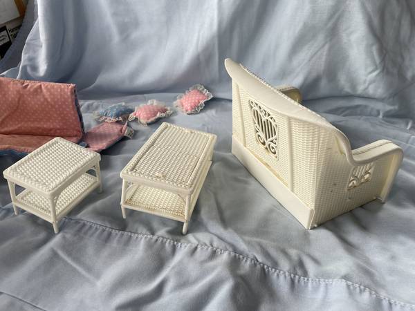 Vintage 1980's Mattel Barbie Cottage Dream White Wicker Furniture Set. Missing the arm chair but has the padding for it. Could use a little cleaning.
