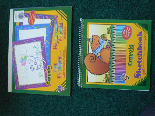 Twelve dozen crayons slightly used or unused in boxes, a bag with another 4 dozen slightly used crayons and many more pieces ($1.49 for 2 dozen new, so that’s $12 of crayons alone if brand new!), set of dual color pencils, some paint and brushes, a couple ZOOGELS to paint, 3D glue (didn’t try it). The sketchbook has 17 sheets, the art framers has 31 sheets (pages are framed like on the cover - $7 at Michaels for a 30 sheet pad) and the finger paint pad 10. Two coloring books, one only had one page colored, the bigger one a few are colored, and a few other items. Send phone number if interested.