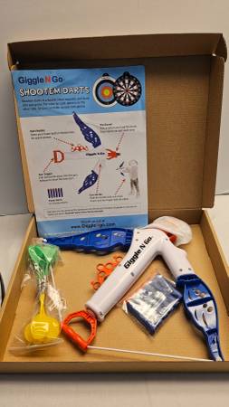 New Giggle N Go Shootem Darts. Double sided magnetic dart game. Includes: Board, Dart Gun, 6 Magnetic Foam Darts and 6 Magnetic Regular Darts. Board is 16" diameter. New Condition.