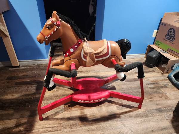 Radio Flyer horse circa 2012(estimated). Missing the carrot and and comb. Works great. Has sound for when rocking(different speeds), and for when chewing(motion sensor when something is put in its mouth) Requires 3 AA batteries. Recently tested and works just like new. Some minor scuffs on top of saddle due to use. Asking $80. Pick-up in Trafford.