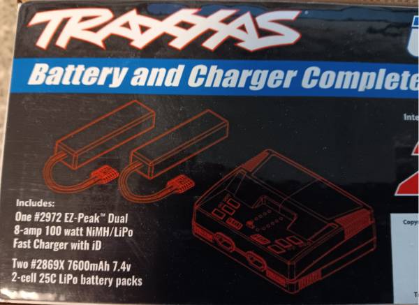 Traxxas 2S LiPo Battery & Charger Completer Pack New In Box - Never Used Traxxas # 2991 Includes two #2869X 2-cell 7600 mAh 7.4-volt LiPo batteries and a #2972 EZ-Peak Dual 8-amp 100 watt...