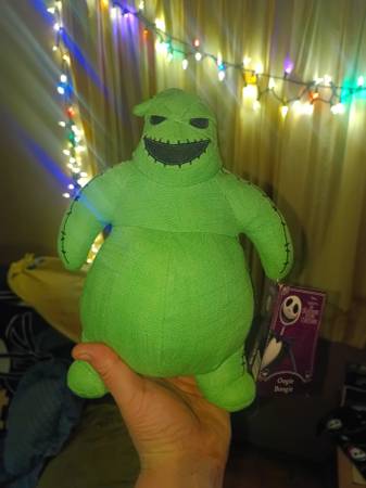 I'm selling my original oogie boogie plush brand new with tags from Disney a couple years ago I also have a vintage Jack skellington stocking from Disney world it's one of the hand knit ones it was like $25 and so was the oogie boogie plush figure it still has tags so you can see 22.99. I also have my boogie boogie hallmark ornament that came from the Disney store as well 18.99 and the rare pop-up in box Zero which is Jack's dog which was 10.99. so you're getting a good deal. I also have two Disney bags and a bunch of Disney stuff toy story stuff if you're interested in little items I can show you that as well. I'm happy to make a deal. The plastic bubble has a small crack in it on the pop-up but nothing crazy it's still really cool. Unfortunately I have to get rid of things here so if interested let me know show contact info