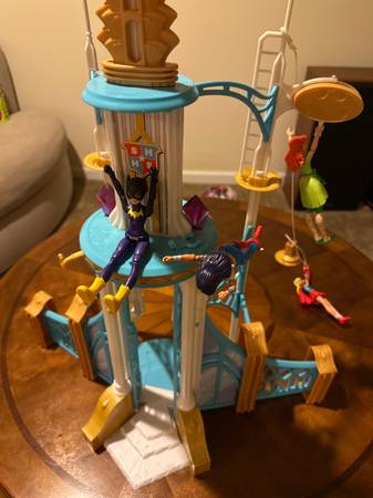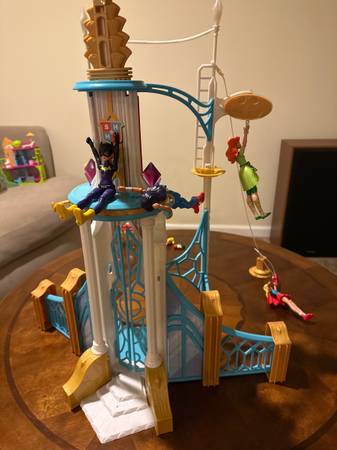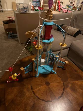 It comes with 4 medium size dolls. They can fly ,climb or zoom on the zip line. Cash and pick up only Thank you!