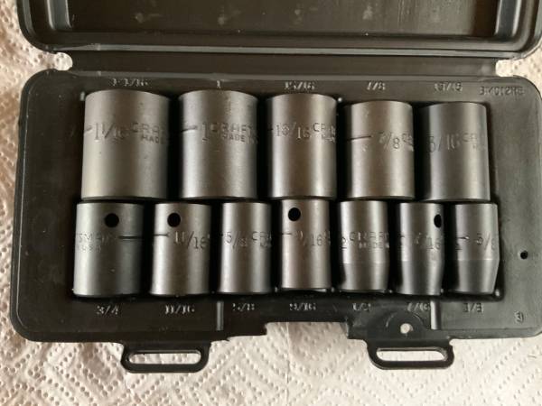 AIR TOOL SYSTEM. MOST ITEMS NEVER USED. (A FEW LIGHTLY USED). CAMPBELL-HAUSFELD KIT (5 HP, 20 GALLON OIL-FREE AIR COMPRESSOR + AIR HOSE, 1/2” DRIVE IMPACT +CHISEL TOOLS WITH ATTACHMENTS): 3/8” DRIVE RATCHET: CUTOFF TOOL AND CUTOFF DISKS: 1/2” DRIVE 12 PIECE STANDARD AND 12 PIECE METRIC IMPACT SOCKETS: 3/8” DRIVE STANDARD (8 PIECE) AND METRIC (9 PIECE) IMPACT SOCKETS.