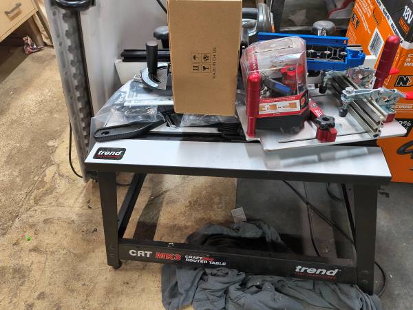 Brand new Bosch 18v 7 1/4" sliding miter kit with batteries and charger Ryobi 18v table saw (saw only) Rail stile router bit set Router Coping sled Shelf pin jig Kobalt router table and router combo...