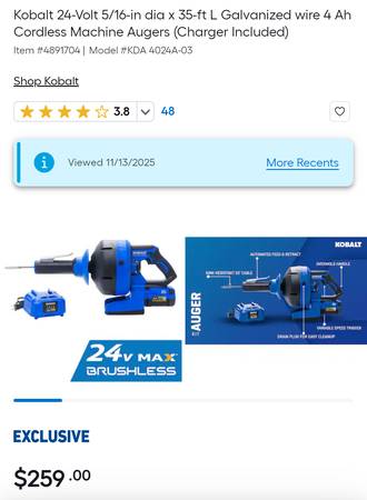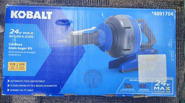 KOBALT Cordless 24 volt 5/16"x35' DRAIN AUGER w/ Battery & Charger Pre-owned, in like new condition, and working properly. Used only one time for one home project. If interested call or text...