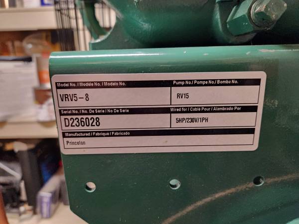 American-made Champion 5HP, 2-stage, 80 gallon air compressor in excellent condition. Less than 3 years old. 19.1 cfm @125 psi. Max psi 175. Very high-quality unit that will last for many years and power sandblast cabinets, air tools, etc. I have less than 150 operating hours on this unit. Am moving and not able to take with me. Retails for $3,000. Can view all specs at tptools.com, model no 8550-66DS. Still connected to electrical service, so you can see and hear it run prior to purchase. Unit weighs over 500 lbs, so you'll need to bring help to load. I can assist and provide one other person to help load, but it will probably need 4 strong guys to put in your truck or trailer.
