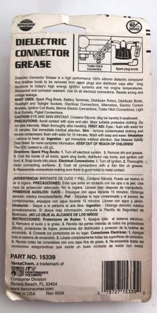 Size:3 Ounce, (Single Unit) Versachem Dielectric Connector Grease is a high performance, 100% silicone dielectric compound that enables boots to be removed from spark plugs and distributor caps after long exposure to high energy ignition systems and hot engine temperatures. Use on all electrical connections to prevent electrical power from migrating between circuitry. This OEM (Original Equipment Manufacturer) specified, waterproof, non-flammable formula is corrosion resistant, hi-temp sensor safe, resistant to alcohol and ketone, and resists arcing and voltage leakage. Works best on spark plugs, battery terminals, distributor rotors, distributor boots, headlight and taillight sockets, electrical connections, alternators, electric control modules, ignition coil boots, marine electric connections, trailer hitch connections, and light bulb sockets. Translucent in color, with a temperature range of -65F to +400F.s Cardboard packaging is not pristine.