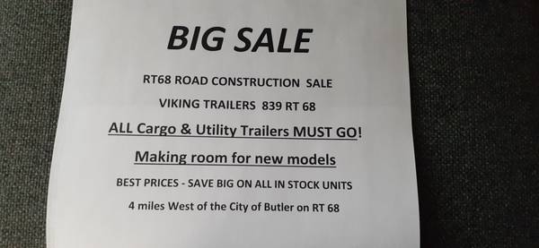 !!**BIG SALE**!! ROUTE 68 ROAD CONSTRUCTION SALE! ALL CARGO AND UTILITY TRAILERS MUST GO!!!! MAKING ROOM FOR NEW MODELS! SAVE BIG ON ALL IN STOCK UNITS!! BEST PRICE!! CALL (WEEKDAYS) BEFORE YOU...