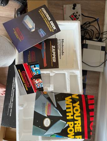 Original boxing, styrofoam, cord toes, powe adaptor, zapper, joystick, / controllers, games, mint condition. Fully functionally, directions to Marrio/Duckhunt and poster. All games included....