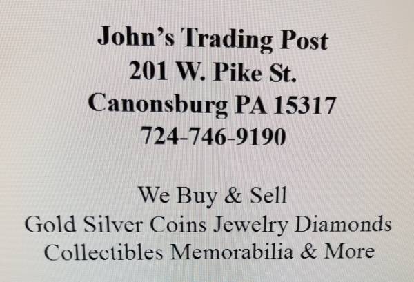 201 West Pike Street Canonsburg PA 15317. Open M-F 11-7, Sat. 1-6, and Sunday 1-6. 724-746-9190. We buy and sell Gold, Silver, Coins, Jewelry, Diamonds, Watches, Tools, Sports Cards, Music Instruments, Lionel Trains, and much, much, more. Free Appraisals.