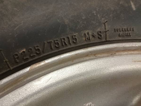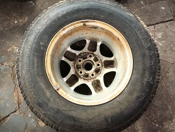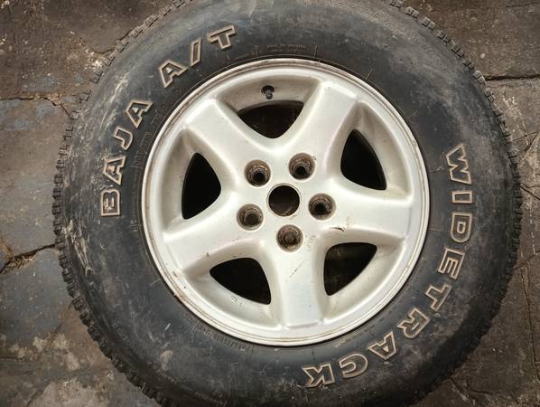 One 2002-2006 Jeep Wheel with Baja A/T Widetrack Tire. Wheel size is 15x7. Wheel bolt pattern is 5x114mm (5x4.50"). Tire size is 225 75 15. Tire tread depth is 9/32.
