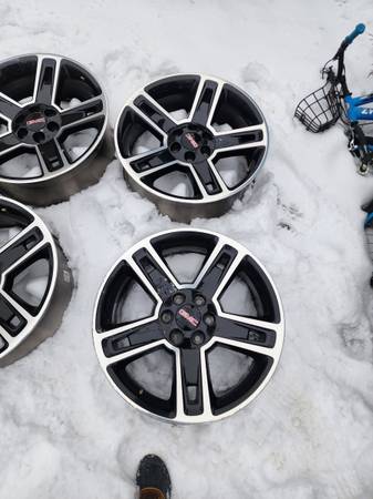 22-inch GM premium 22inch wheels. These come off a 2019 Silverado Rally edtion. Center caps are easily interchangeable and can be found on eBay or amazon for under 25.00 for a set of 4 with fast free shipping if you have a Chevy or Escalade. These wheels are Genuwine GM equipment retailing for over $899.99 each without a sensor or center cap. Complete night and day difference as to what your trucks appearance and stance will be. Im located in Erie Pennsylvania or delivery is available with paid deposit. If interested call or text me at