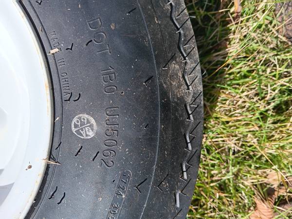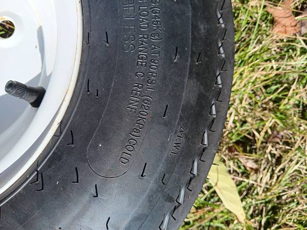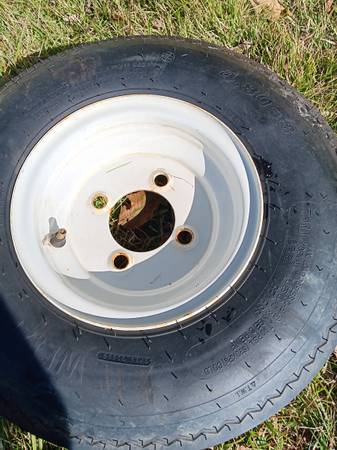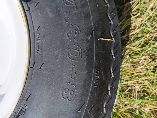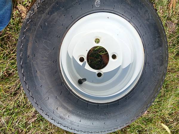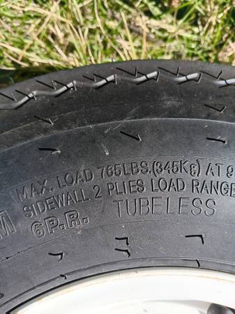 Excellent condition tires and rims with less than 1,000 miles on them. Comes with the nuts and bolts to attach to trailer frame. Tubeless 4.80-8. 71M. Max load 765 lb per tire at 90 psi cold. Tire...
