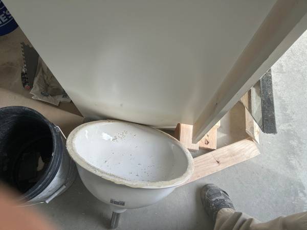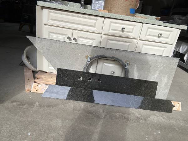 Granite countertop with sink bowl. Around 41” in the back and angled on the left side to 62” wide. 20.5” deep.