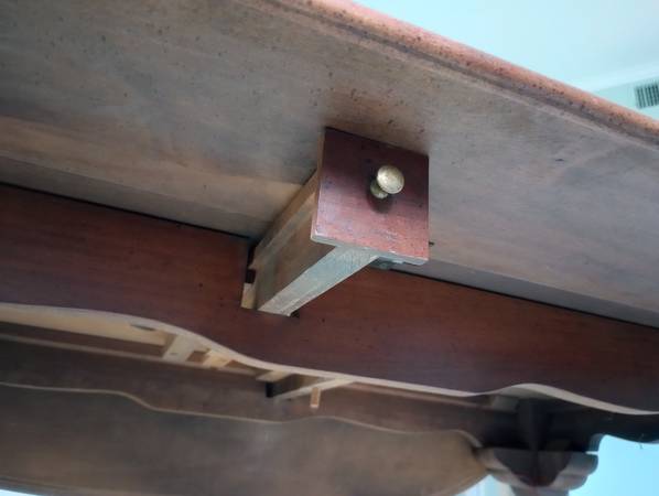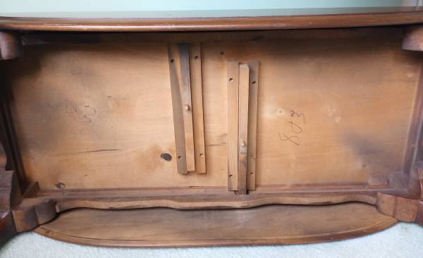Vintage hardwood coffee table, circa 1940s. Hinged dropleaf both sides with pull-out supports beneath.