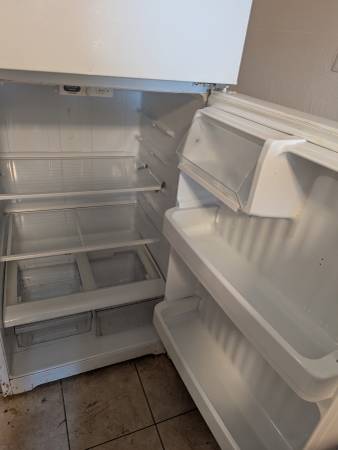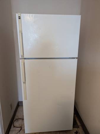 Hotpoint refrigerator. FREE. works. Some rust. 28 x 65. Must be able to lift over counter to get out of house. And take down outside steps