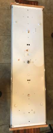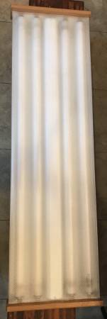 Fluorescent light fixture, hard-wire connection, fixture and all bulbs work great. Metal fixture base with wood endcaps and plastic shade. Length: 4' 1.5" Width: 14.5" Thickness: 3"