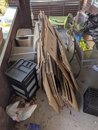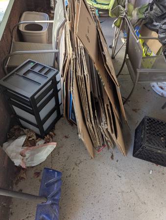 PORCH PICKUP! Come grab this big stack of nice moving boxes off the porch. Take the plastic drawers next to them too if you want!